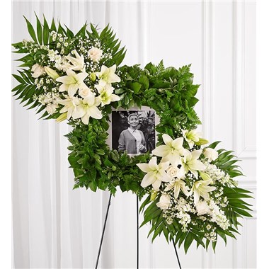 Celebrate the cherished memories you shared with a beautiful floral arrangement. Our unique design features a square wreath of greenery—perfect for displaying a photo—and two sprays on each end gathered with soothing white blooms for a lush, full presentation. It’s a special tribute to honor the life of a loved one.